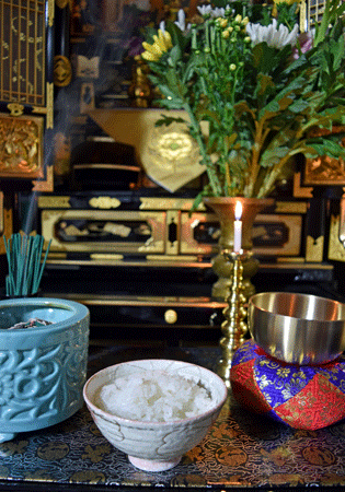あの猛暑続きが一転秋雨前線での大雨でコシヒカリ刈り入れが遅れそれでもやっと刈り入れまずは仏さまに新米のお供えです。